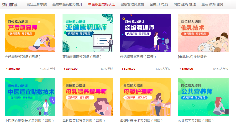 多年來(lái),學(xué)學(xué)網(wǎng)在線學(xué)習(xí)平臺(tái)致力于打造互聯(lián)網(wǎng)+健康教育+職業(yè)培訓(xùn)+大數(shù)據(jù)新型健康教育平臺(tái),課程覆蓋康復(fù)技術(shù)、母嬰技術(shù)、傳統(tǒng)技術(shù)、預(yù)防保健等大健康領(lǐng)域,其中中醫(yī)康復(fù)理療師、中醫(yī)健康管理師、養(yǎng)老護(hù)理師、心理咨詢(xún)師、公共營(yíng)養(yǎng)師等深受學(xué)員好評(píng)。