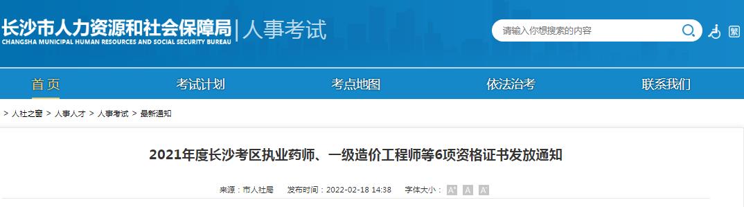 2021年度長沙考區(qū)執(zhí)業(yè)藥師、一級(jí)造價(jià)工程師等6項(xiàng)資格證書發(fā)放通知