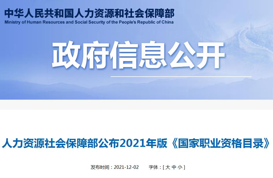 人力資源社會保障部公布2021年版《國家職業(yè)資格目錄》原文地址:http://www.mohrss.gov.cn/xxgk2020/1_2_x/jd/202112/t20211202_429298.html
