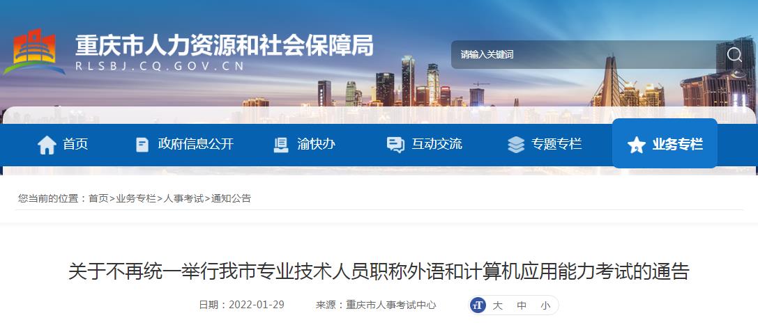 根據(jù)中共中央辦公廳、國務(wù)院辦公廳《關(guān)于深化職稱制度改革的意見》(中辦發(fā)〔2016〕77號)提出的“對職稱外語和計算機(jī)應(yīng)用能力考試不作統(tǒng)一要求”精神,結(jié)合考試安排和實際情況,經(jīng)研究,自2022年1月1日起,我市不再統(tǒng)一舉行專業(yè)技術(shù)人員職稱外語和計算機(jī)應(yīng)用能力兩項考試。用人單位確有需要繼續(xù)開展考試的,可與市人事考試中心聯(lián)系(咨詢電話:023-88979847),指導(dǎo)幫助其自行組織實施。