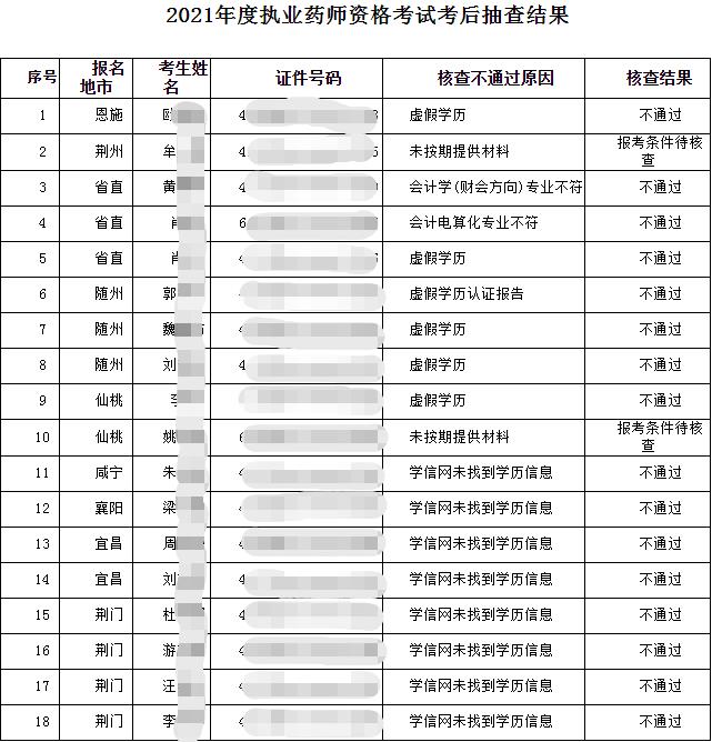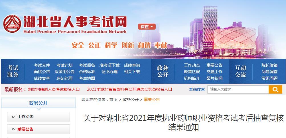 關(guān)于對(duì)湖北省2021年度執(zhí)業(yè)藥師職業(yè)資格考試考后抽查復(fù)核結(jié)果通知