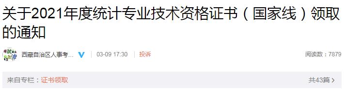 西藏考區(qū)2021年度統(tǒng)計專業(yè)技術(shù)資格證書(國家線)已開始發(fā)放。請符合條件的考生,于3月11日至3月18日(工作日上午09:30—13:00,下午15:30—18:00)選擇以下方式之一領(lǐng)取證書。