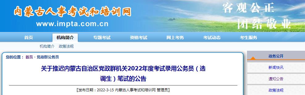 關(guān)于推遲內(nèi)蒙古自治區(qū)黨政群機(jī)關(guān)2022年度考試錄用公務(wù)員(選調(diào)生)筆試的公告