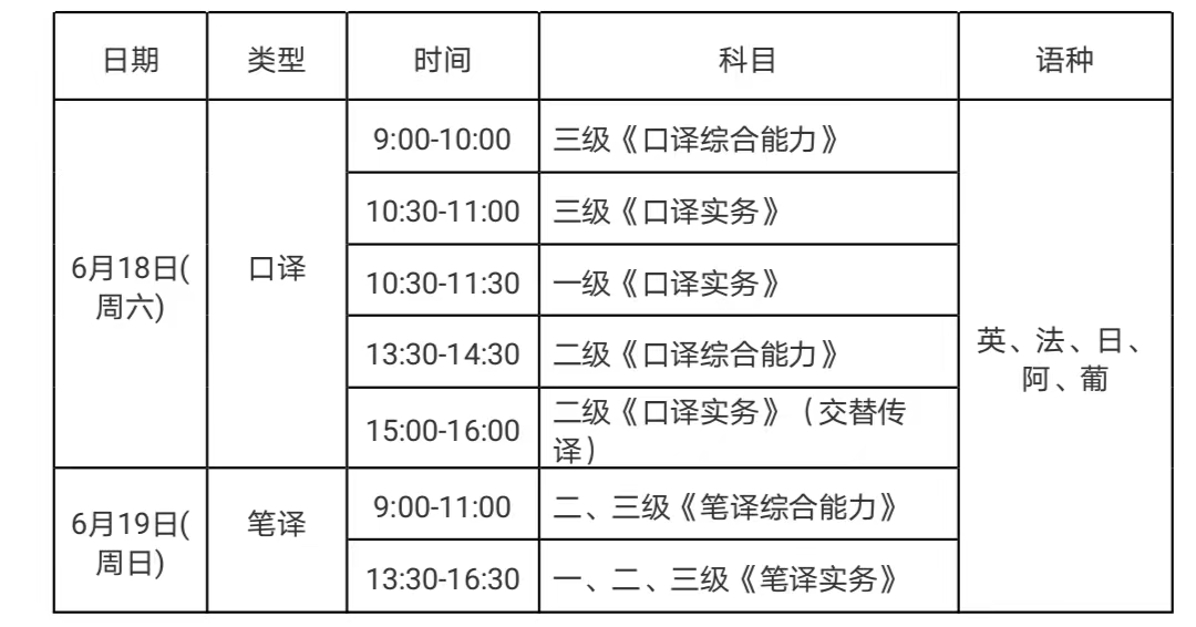 一級(jí)口譯考試設(shè)《口譯實(shí)務(wù)》1個(gè)科目,二、三級(jí)口譯考試設(shè)《口譯綜合能力》和《口譯實(shí)務(wù)》2個(gè)科目。一級(jí)筆譯考試設(shè)《筆譯實(shí)務(wù)》1個(gè)科目,二、三級(jí)筆譯考試設(shè)《筆譯綜合能力》和《筆譯實(shí)務(wù)》2個(gè)科目。具體時(shí)間安排如下: