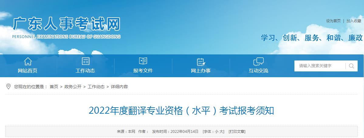 根據(jù)人力資源和社會(huì)保障部人事考試中心《關(guān)于做好2022年度翻譯專(zhuān)業(yè)資格(水平)考試考務(wù)工作的通知》(人考中心函〔2022〕10號(hào))和廣東省人力資源和社會(huì)保障廳《關(guān)于廣東省人力資源社會(huì)保障系統(tǒng)2022年度專(zhuān)業(yè)技術(shù)人員職業(yè)資格考試計(jì)劃及有關(guān)事項(xiàng)的通知》(粵人社函〔2022〕21號(hào))要求,為方便廣大考生報(bào)考該項(xiàng)考試,現(xiàn)將有關(guān)事項(xiàng)告知如下。