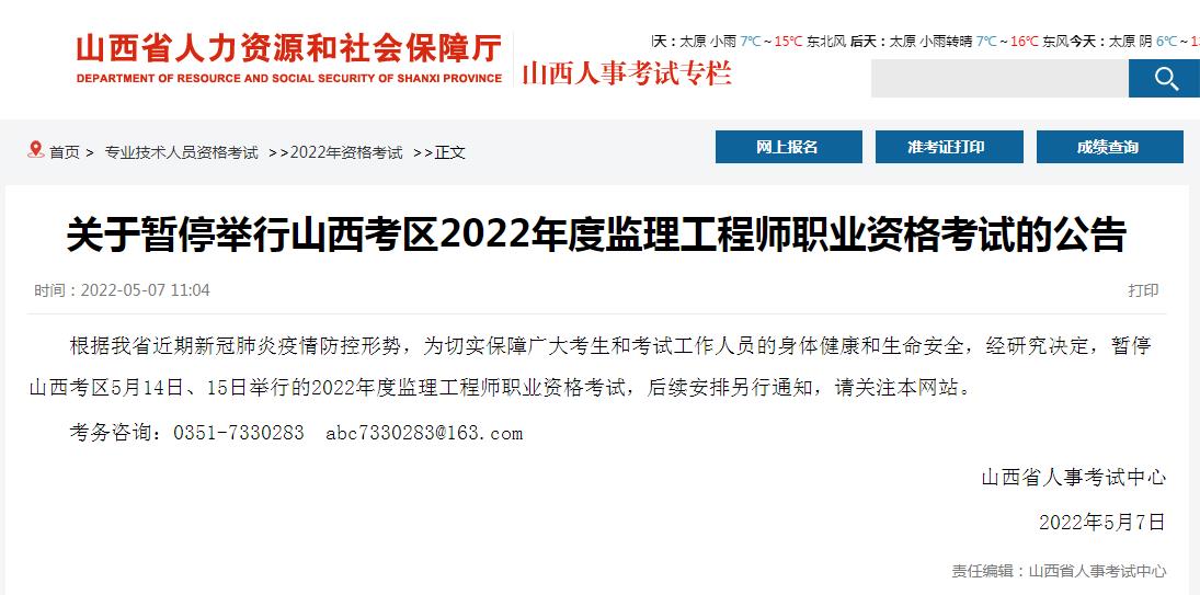 關(guān)于暫停舉行山西考區(qū)2022年度監(jiān)理工程師職業(yè)資格考試的公告