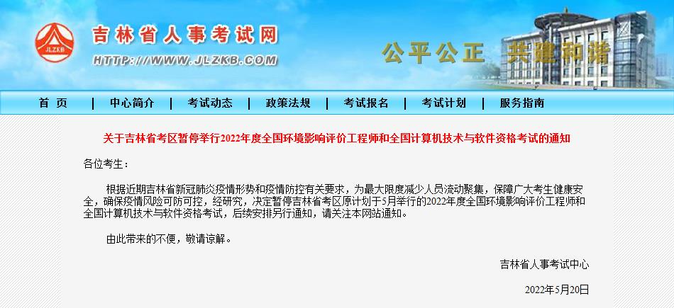 關(guān)于吉林省考區(qū)暫停舉行2022年度全國環(huán)境影響評價工程師和全國計算機(jī)技術(shù)與軟件資格考試的通知