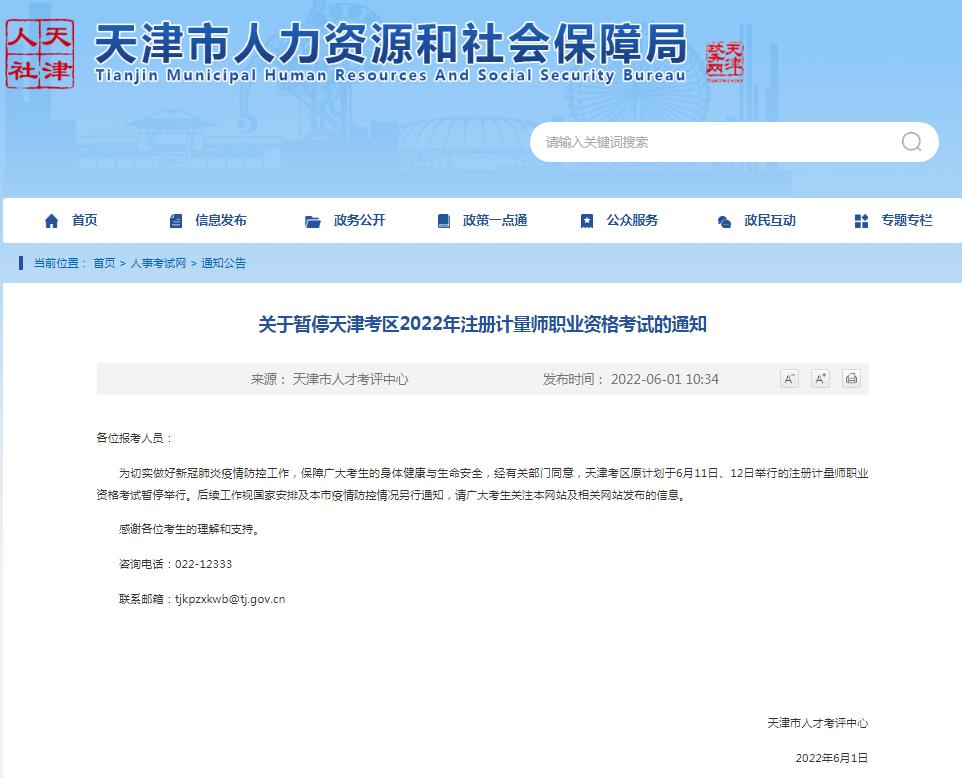 關(guān)于暫停天津考區(qū)2022年注冊計量師職業(yè)資格考試的通知