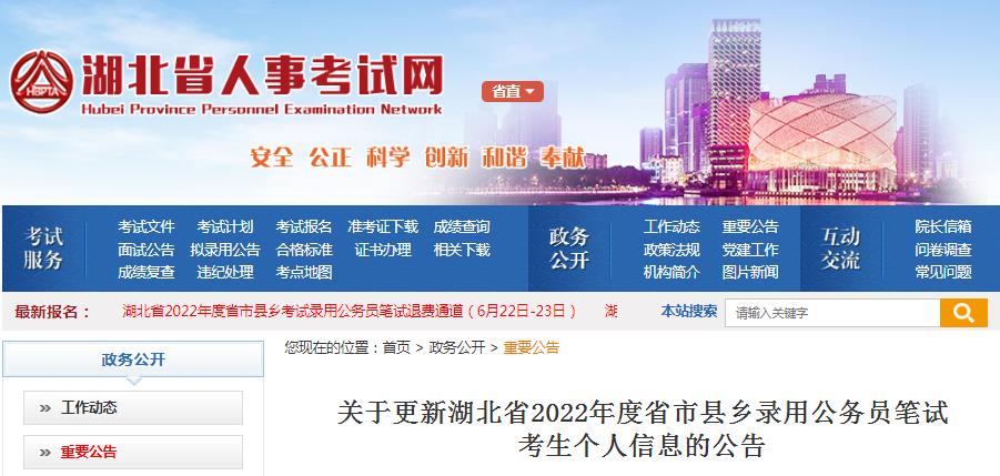 關(guān)于更新湖北省2022年度省市縣鄉(xiāng)錄用公務(wù)員筆試考生個(gè)人信息的公告