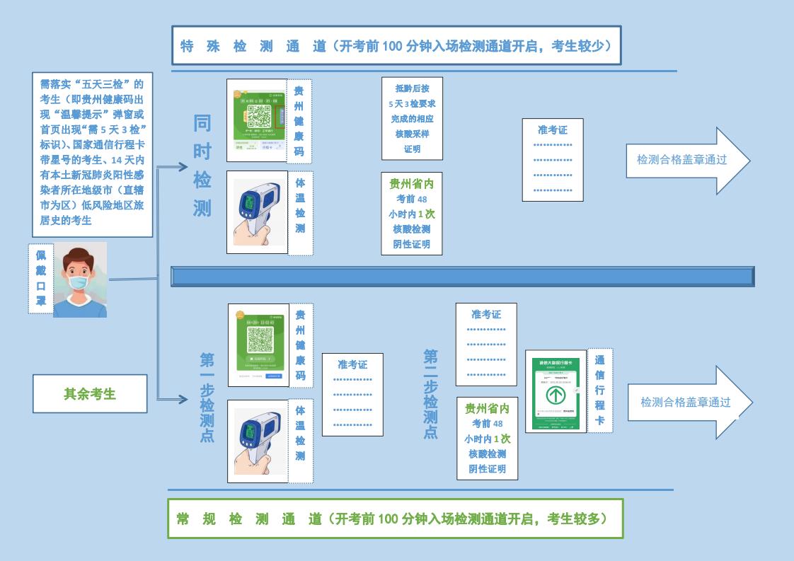 考生到特殊檢測通道提交考試當天本人“貴州健康碼綠碼”、“抵黔后按5天3檢要求完成的相應(yīng)次數(shù)的核酸采樣證明”、“貴州省內(nèi)考前48小時內(nèi)1次核酸檢測陰性證明”、《準考證》等相應(yīng)證明材料報檢測人員核驗并接受體溫檢測。經(jīng)檢測合格的,檢測人員在《準考證》上加蓋入場檢測合格章。