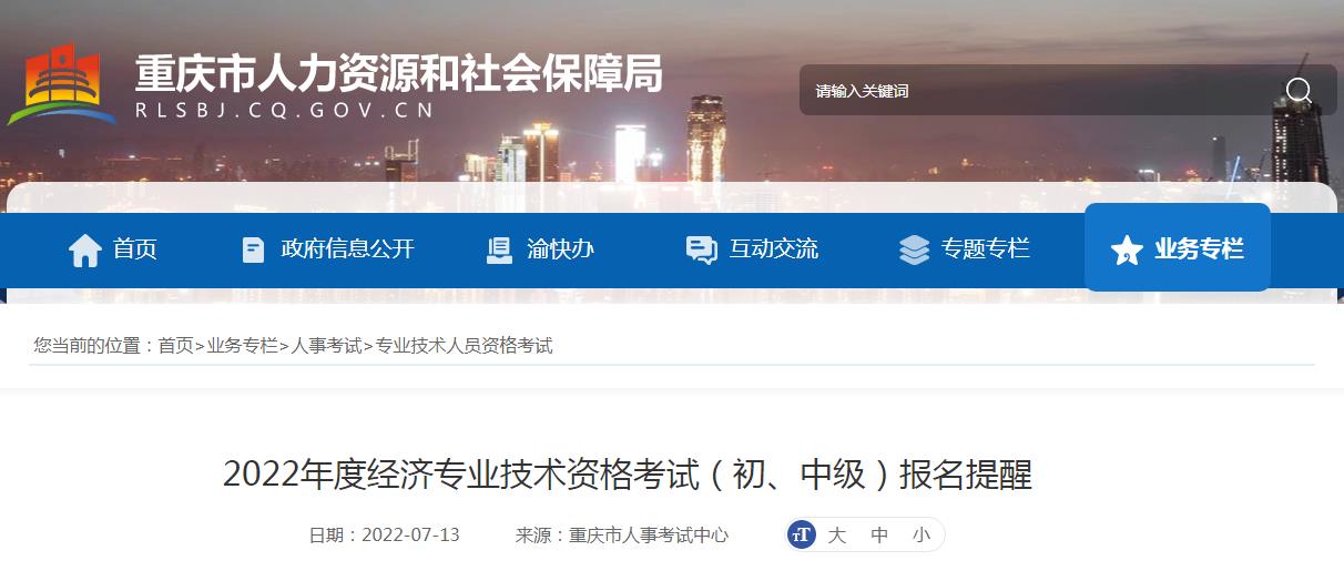 2022年度經(jīng)濟(jì)專業(yè)技術(shù)資格考試(初、中級(jí))報(bào)名提醒重慶地區(qū)2022年度經(jīng)濟(jì)專業(yè)技術(shù)資格考試(初、中級(jí))考試即將網(wǎng)上報(bào)名。報(bào)考要求詳見重慶市人力資源和社會(huì)保障局網(wǎng)站“人事考試”欄目中《關(guān)于2022年度經(jīng)濟(jì)專業(yè)技術(shù)資格考試報(bào)名工作的通告》。報(bào)考人員可登錄中國(guó)人事考試網(wǎng)(www.cpta.com.cn)進(jìn)行網(wǎng)上報(bào)名。報(bào)名時(shí)間:7月19日9:00─7月28日17:00;繳費(fèi)時(shí)間:7月19日9:00─7月29日17:00。