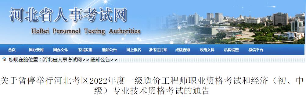 關(guān)于暫停舉行河北考區(qū)2022年度一級造價工程師職業(yè)資格考試和經(jīng)濟(jì)(初、中級)專業(yè)技術(shù)資格考試的通告