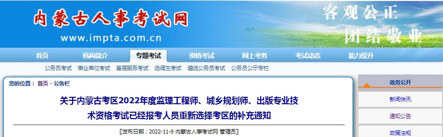 關(guān)于內(nèi)蒙古考區(qū)2022年度監(jiān)理工程師、城鄉(xiāng)規(guī)劃師、出版專業(yè)技術(shù)資格考試已經(jīng)報考人員重新選擇考區(qū)的補充通知