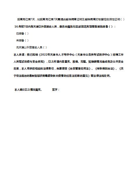 筆試當天攜帶本人簽字的紙質(zhì)版《2022年天津市人才考評中心(天津市公務(wù)員考試測評中心)招聘工作人員筆試流行病學調(diào)查表》(附件2)參加考試。