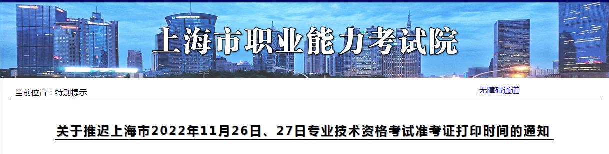 關(guān)于推遲上海市2022年11月26日、27日專業(yè)技術(shù)資格考試準(zhǔn)考證打印時間的通知
