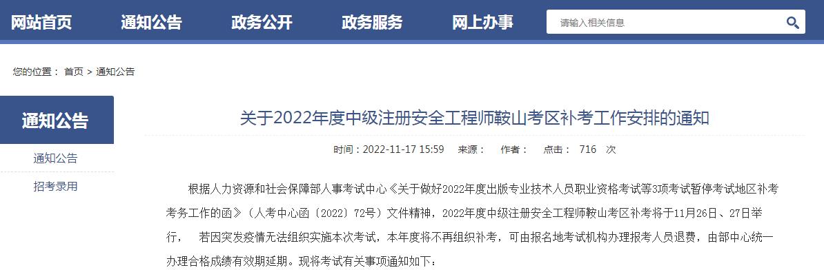 關(guān)于2022年度中級注冊安全工程師鞍山考區(qū)補考工作安排的通知
