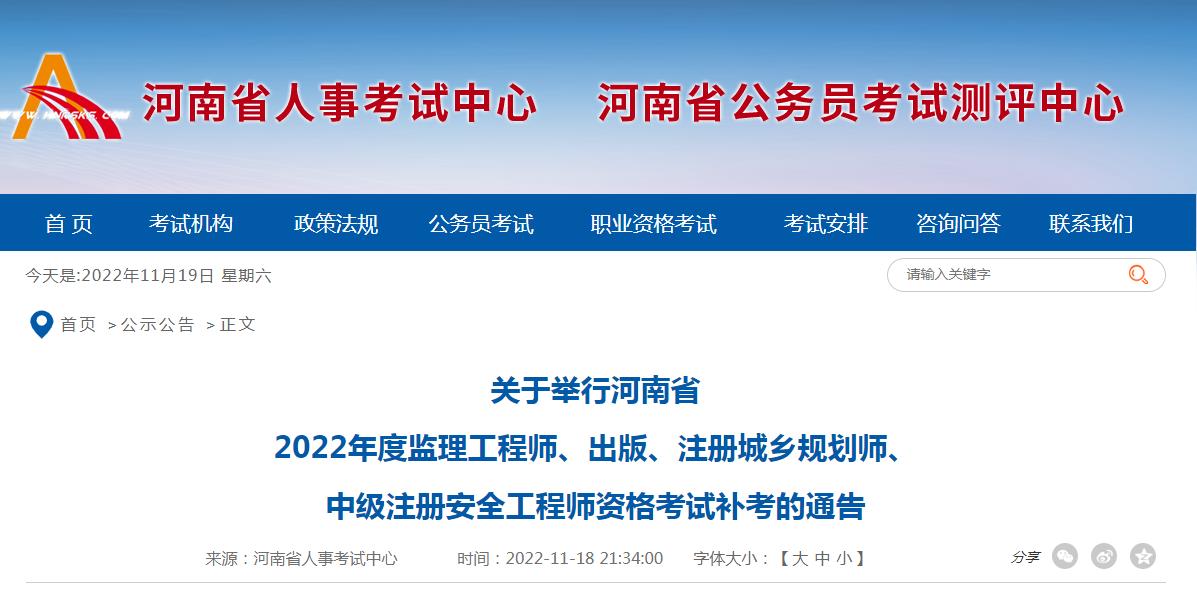 關(guān)于舉行河南省2022年度監(jiān)理工程師、出版、注冊城鄉(xiāng)規(guī)劃師、中級注冊安全工程師資格考試補(bǔ)考的通告