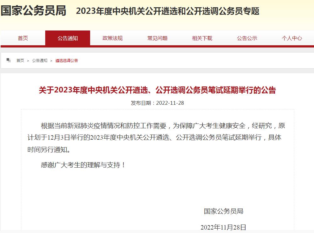 根據(jù)當(dāng)前新冠肺炎疫情情況和防控工作需要,為保障廣大考生健康安全,經(jīng)研究,原計劃于12月3日舉行的2023年度中央機(jī)關(guān)公開遴選、公開選調(diào)公務(wù)員筆試延期舉行,具體時間另行通知。