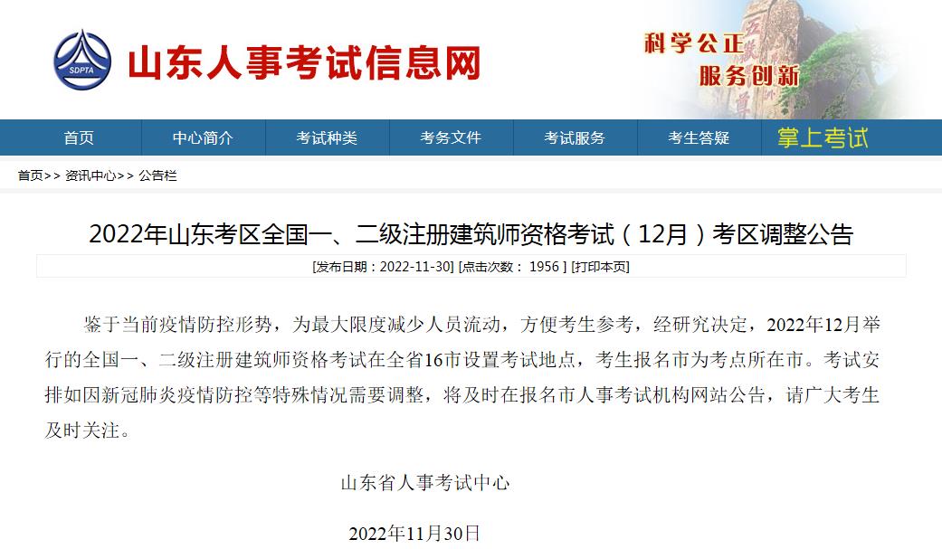 2022年山東考區(qū)全國(guó)一、二級(jí)注冊(cè)建筑師資格考試(12月)考區(qū)調(diào)整公告
