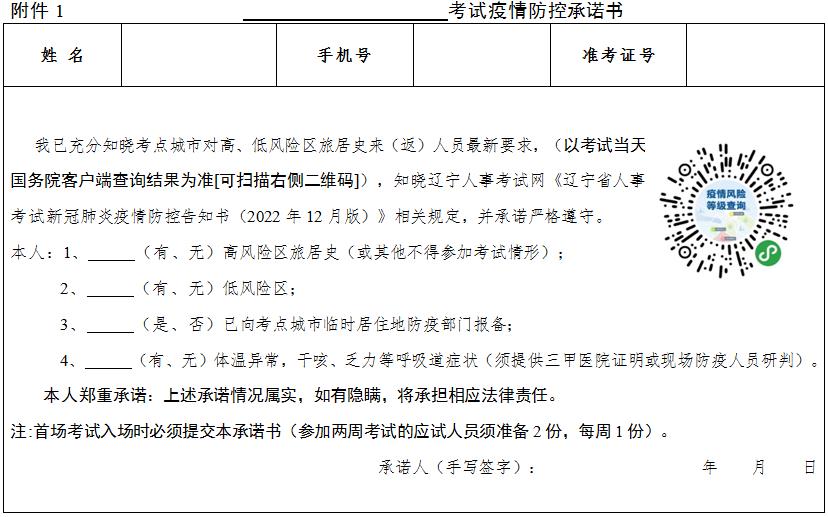 七、考生應認真閱讀《遼寧省人事考試新冠肺炎疫情防控告知書(2022年12月版)》和《疫情防控承諾書》,提前打印準考證并做好相應準備??忌蛴士甲C即視為閱知并認同告知書內容。如違反相關規(guī)定,自愿承擔相關責任、接受相應處理。