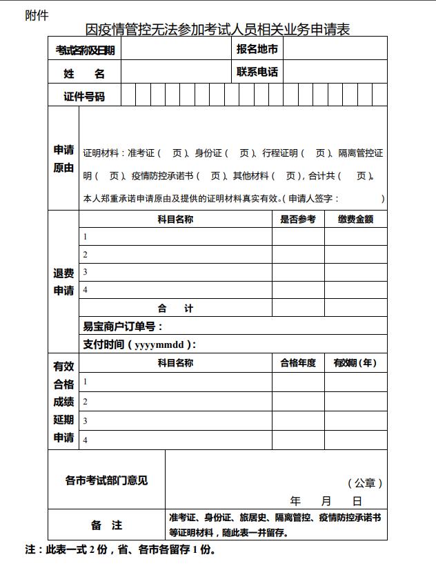 1.《因疫情管控無法參加考試人員相關(guān)業(yè)務(wù)申請表》(見附件);
