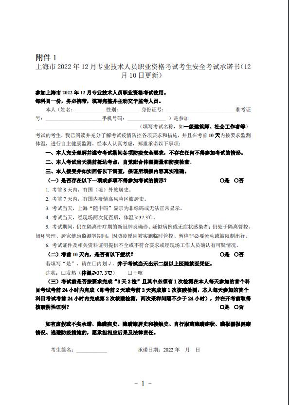 上海市2022年12月專業(yè)技術人員職業(yè)資格考試考生安全考試承諾書(12月10日更新)