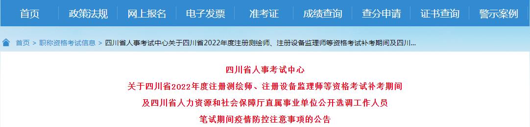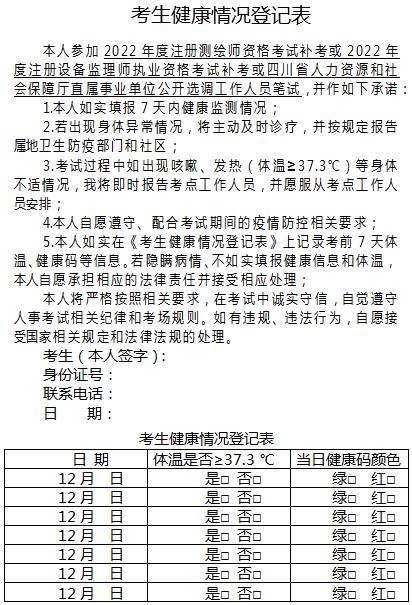 為嚴格貫徹落實新冠疫情防控有關要求,全力確保每一位考生安全健康,根據(jù)當前疫情情況,現(xiàn)就我省將于12月24日、25日舉行的2022年度注冊測繪師資格考試、注冊設備監(jiān)理師執(zhí)業(yè)資格考試補考及四川省人力資源和社會保障廳直屬事業(yè)單位公開選調(diào)工作人員筆試期間考生疫情防控事項告知如下: